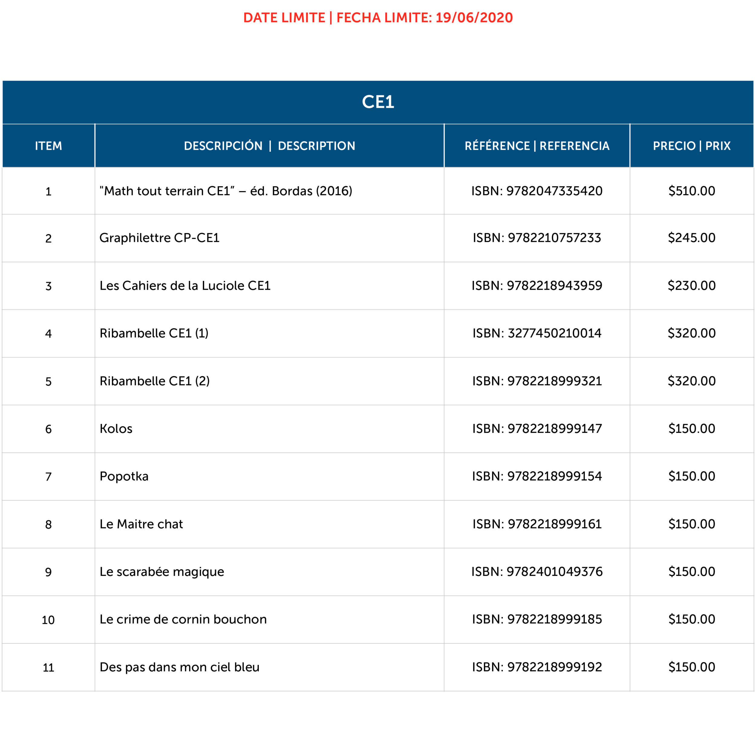 ** Le matériel sera fourni, aux élèves, le premier jour de classes; cependant, un éventuel retard dû à l'éventualité doit être envisagé. / El material se entregará, a los alumnos directamente en la EFAD. La fecha estimada es el primer día de clases; sin embargo, hay que considerar que pudiera retrasarse debido a la contingencia.