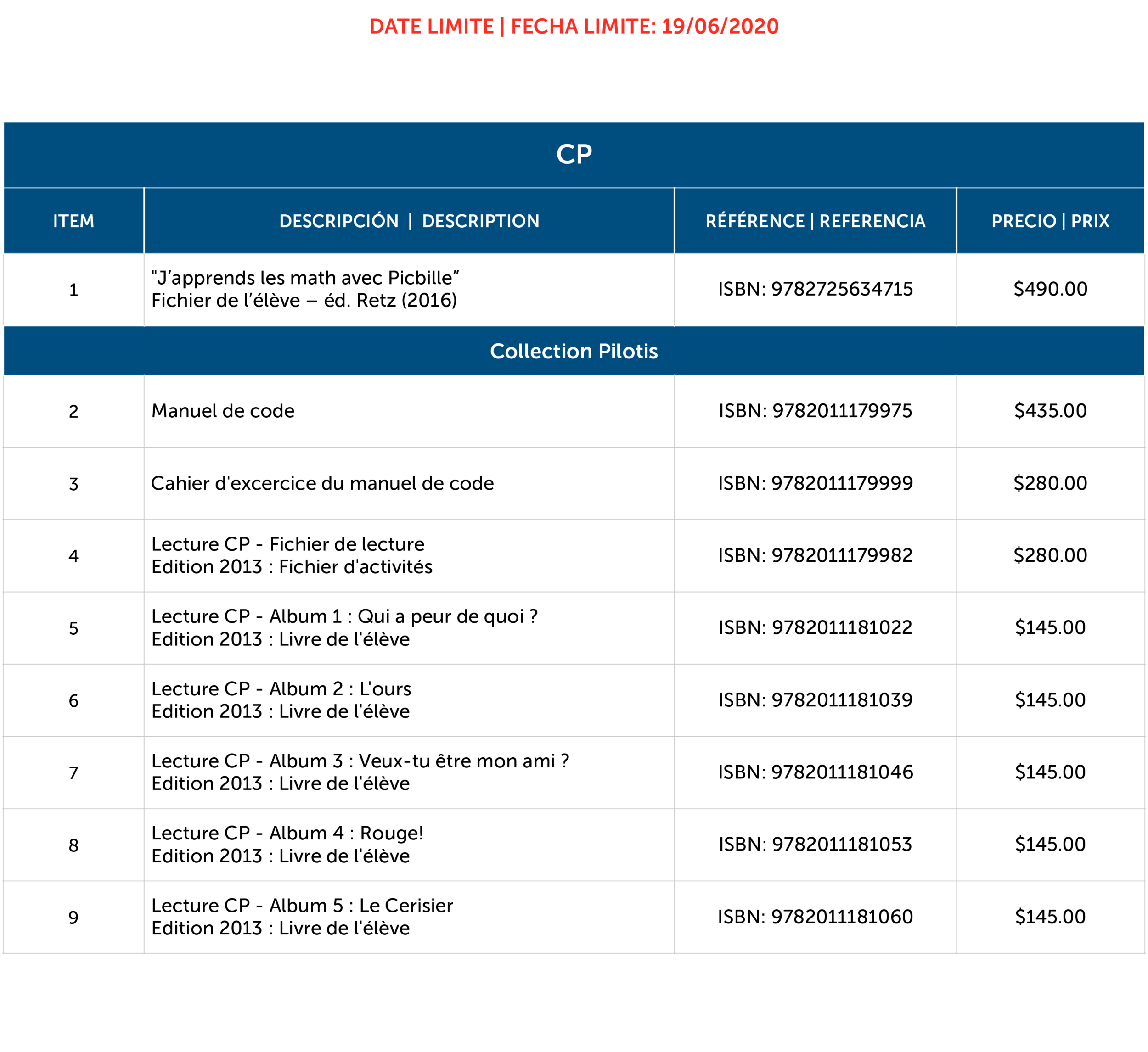 ** Le matériel sera fourni, aux élèves, le premier jour de classes; cependant, un éventuel retard dû à l'éventualité doit être envisagé. / El material se entregará, a los alumnos directamente en la EFAD. La fecha estimada es el primer día de clases; sin embargo, hay que considerar que pudiera retrasarse debido a la contingencia.
