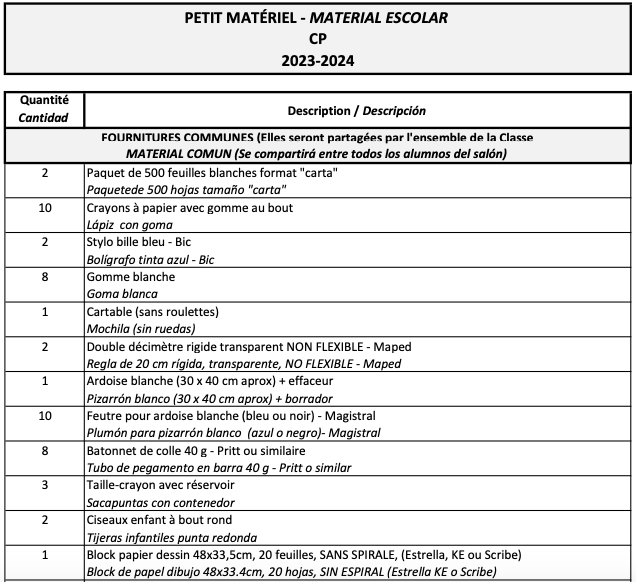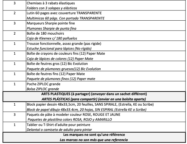 Le matériel sera fourni aux élèves le premier jour de classe.